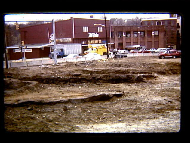 View of excavation of Market Square to locate remains of Blackstone Canal mill trenches and locks. Part of Main