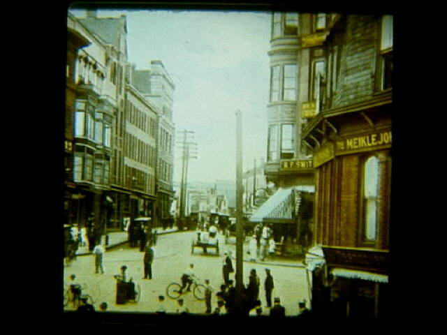 MS172 1915 (c) View of Main Street showing Depot Square area with many pedestrians and horse and wagon activity.