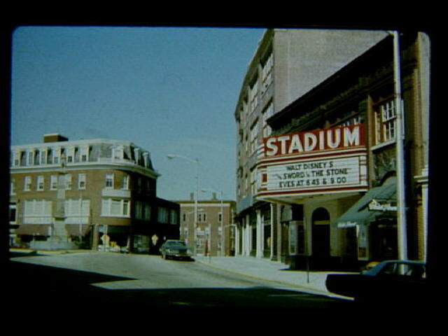 MS175 1974 (c) Monument Square featuring monument, Stadium Theatre marquee, and the Brown-Carroll building.