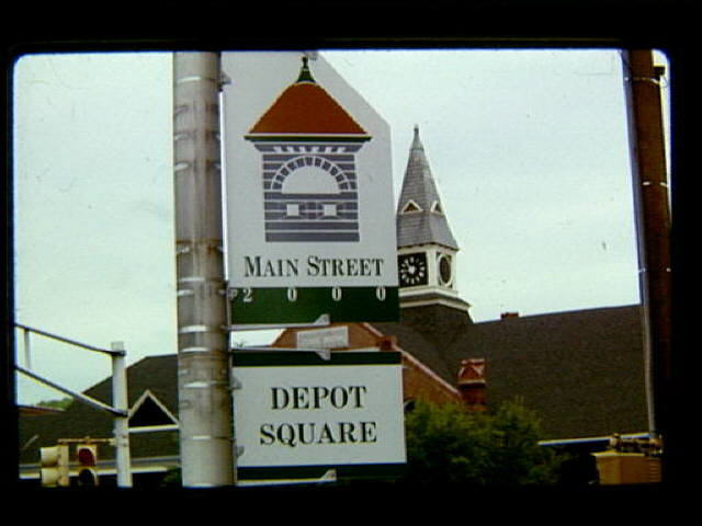 View of Main Street showing close-up view of sign for Depot Square erected by Main Street 2000. Depot is in