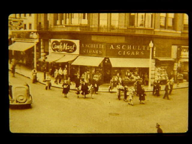 View of Depot Square/Main Street. View of A. Schulte Cigar Store and Candy Mart in the Longley Building.