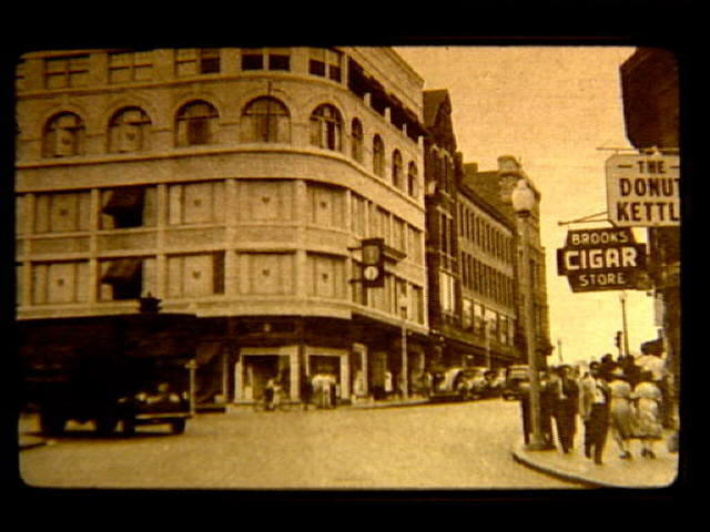 Granite Block in distance. Pedestrians, traffic.