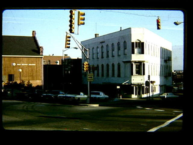 MS108 1970 (c) View of Main Street/Depot Square area highlighting Hope Building painted white. Edge of depot at left.