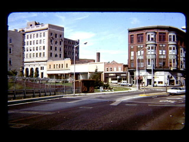 View of Main Street/Depot Square area from Court Street Bridge. Longley Building, Bryant Block, Lerner Shops, mini-