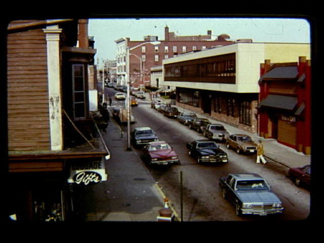 Main Street from the P&W Railroad bridge looking towards Monument Square. Buildings on left side are a parking lot