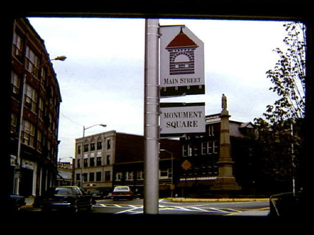 MS135 1991 July Main Street at Monument Square showing signage, taken from Social Street.