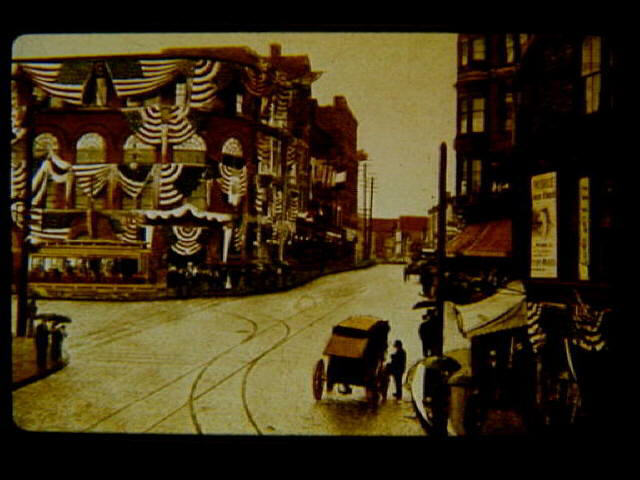 MS181 1915 (C) Main Street postcard view looking towards Depot Square from vicinity of P&W railroad bridge over Main Street. McCarthy's bedecked with flags.