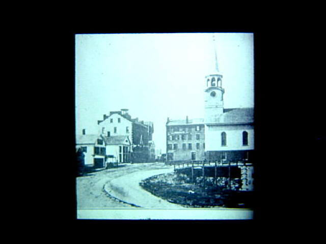 MS83 1860 (c) Depot Square/Main Street area showing Baptist Church, part of depot, the Bryant Block, Patriot Block, and part of Harris Block.