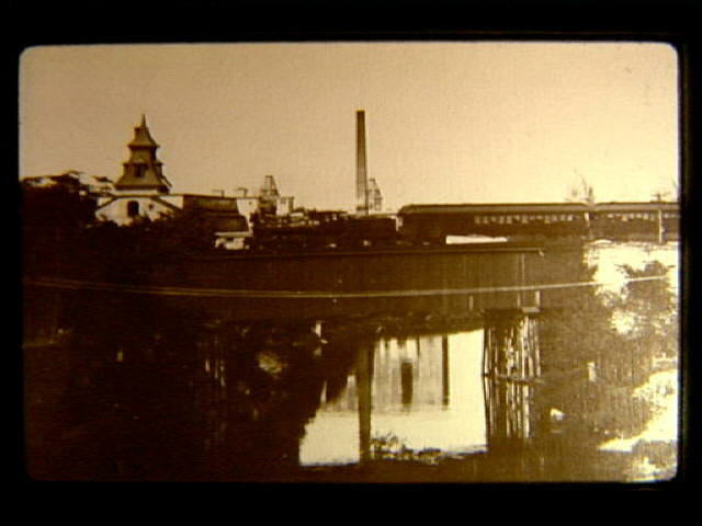 Northbound P&W passenger train on the bridge over the Blackstone south of the Woonsocket depot.