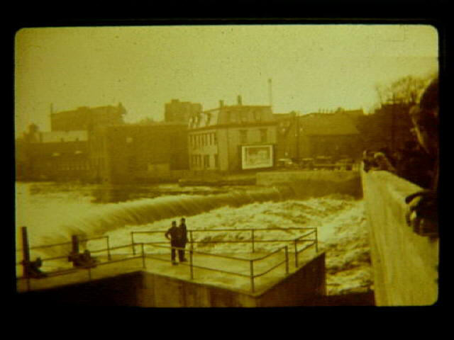 DA 12 1930's Bernon dam showing high water. People on Bernon Street bridge observing the water.