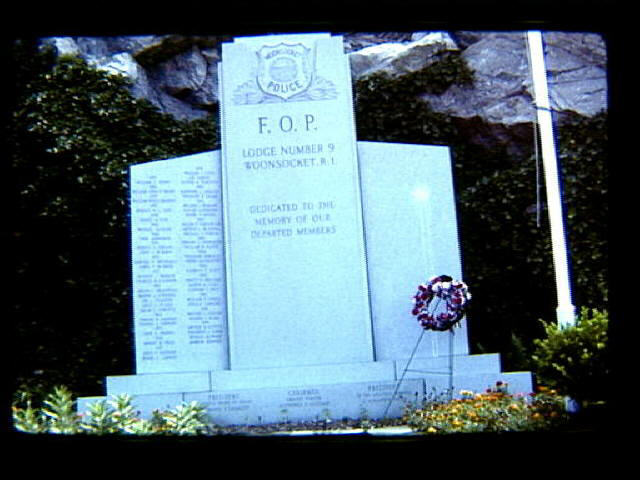 MO 59 1991 August F.O.P. monument at Cumberland Hill Road near Hamlet Avenue. Dedicated in 1963 to commemorate all city police officers. Two side panels were added in 1990 with the names of deceased Woonsocket Police Officers.