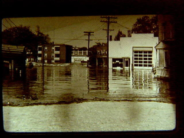 Flood of 1955 showing River Street bridge covered with water. Street level picture.