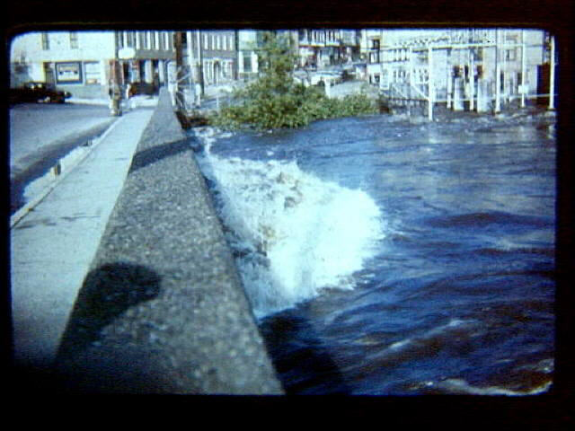 Flood of 1955 showing waters pounding the Sayles Street bridge.