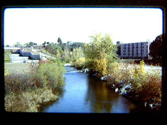 RP 25 1991 October The Mill River from the Privilege Street bridge looking north showing Harris Pond dam and Riverview Apartment complex. Harris Pond dam is now called Soucy Falls at the site of the former Horseshoe Falls dam, built by Edward Harris, which was breached during the flood of 1955.