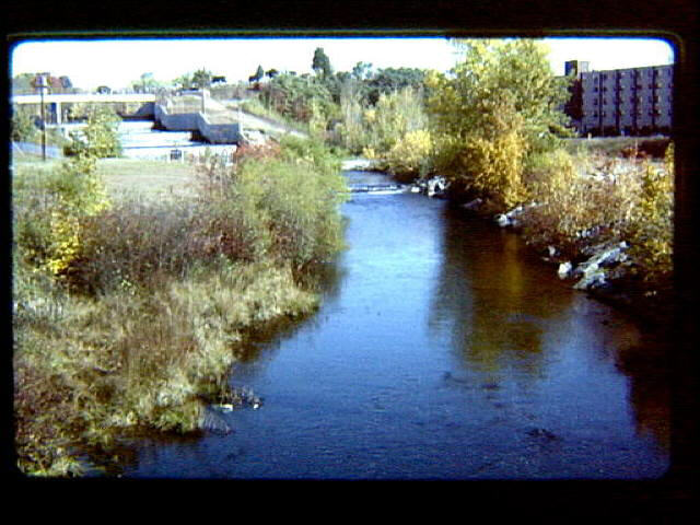 The Mill River looking north from the Privilege Street bridge showing Riverview Apartment complex and Soucy Falls.