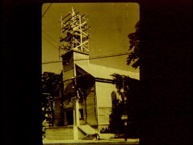 Saint James Episcopal church reconstruction. Steeple and front entrance.