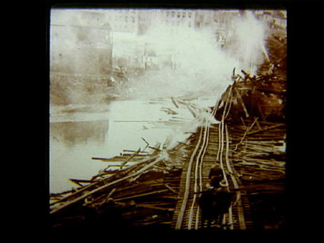 "Bandwagon" railroad bridge near River Street, once part of the "Air Line." Photo of fire that destroyed the original