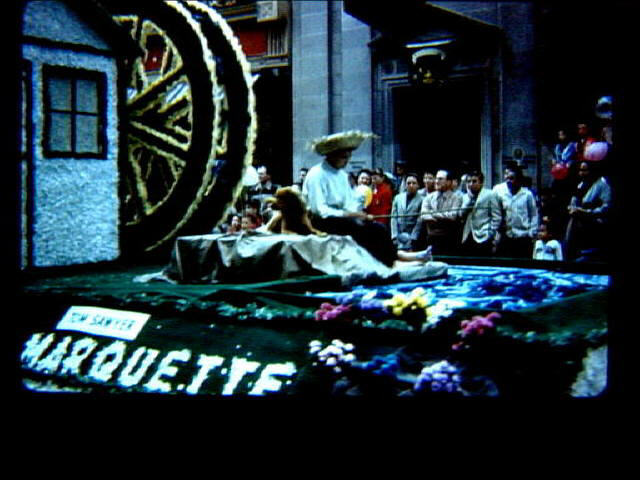 EV 117 1958 Mardi Gras parade on Main Street showing Club Marquette float with Tom Sawyer theme.