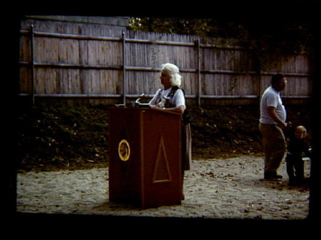 View of Phyllis Thomas expressing gratitude at the dedication of monument in park named in her honor.