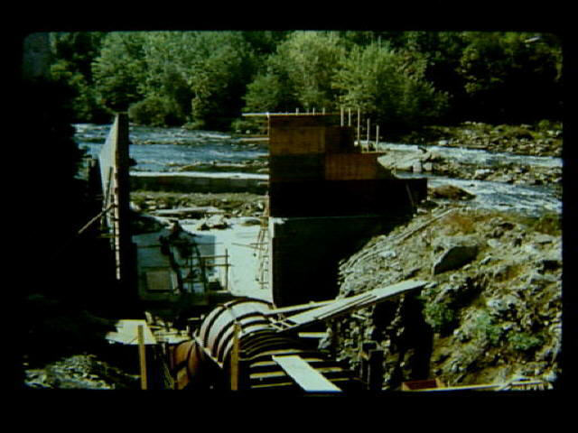 Thundermist Hydroelectric plant at Woonsocket Falls. Construction photo looking towards the Wading Place.