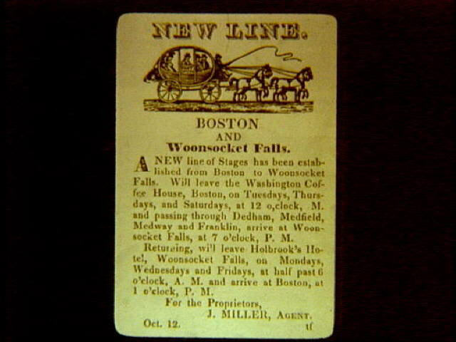 Stage coach ad from the Woonsocket Patriot advertising a trip on the new line from Boston to Woonsocket Falls.