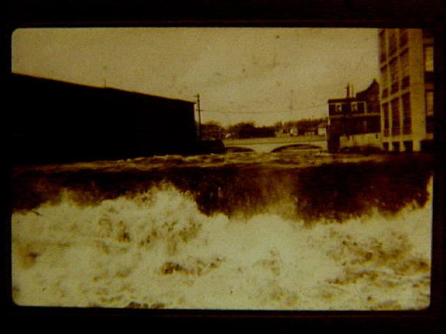 Flood waters washing over right side of the old Woonsocket Falls dam as viewed from the Globe bridge.