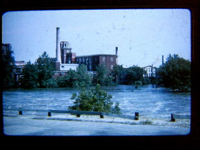 Flood of 1955 showing waters behind mills on Island Place, below Woonsocket Falls.