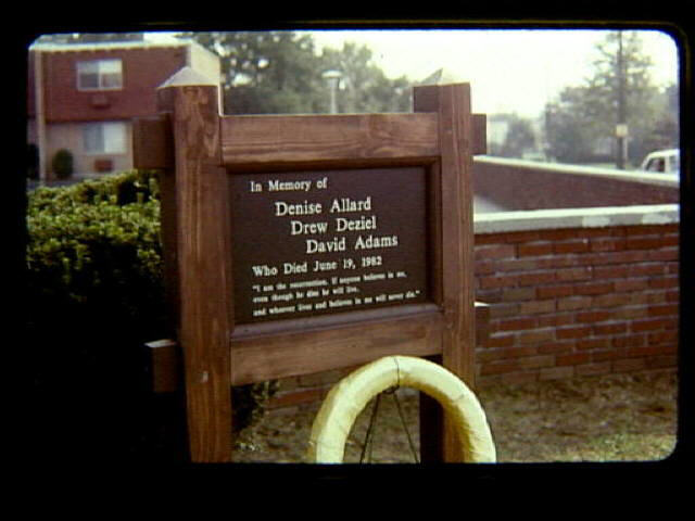 MO 6 1983 The ADA memorial at Diamond Hill and Walnut Hill Roads. Plaque is in honor of Denise Allard, Drew Deziel and David Adams, three teenagers who died on June 19, 1982 in an automobile accident at the intersection.